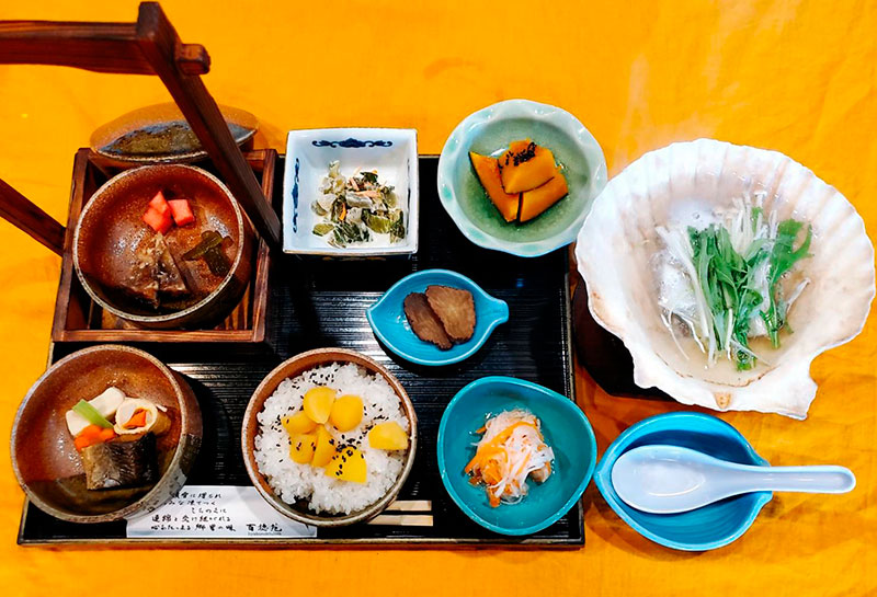 首穂鍋やシヨツツル貝焼のついた栗おこわ定食のほか、予約により栗おこわ点心料理や栗おこわ山菜料理としてもお召しあがりいただいています。