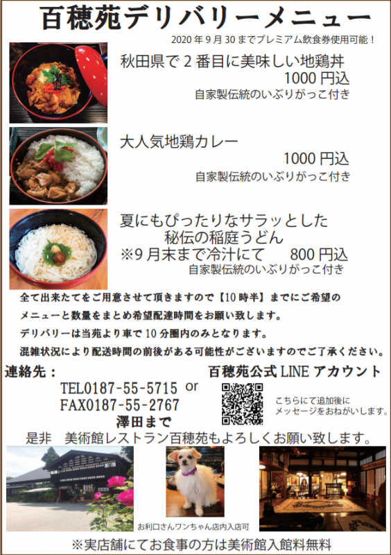 当苑自慢の料理のデリバリーを開始致しました。昔ながらの伝統的な稲庭うどん及び丁寧に下味を整え人気メニューとなっている地鶏丼、地鶏カレーの出来たてをお届けに上がります。出来たてをお持ちするので当苑より車で10分圏内のお届けとなります。2020年9月30日までは秋田県プレミアム飲食券の使用も可能です。注文は朝の10時30分までとなりますがそれ以降のお時間でも一度ご相談下さい。注文方法はお電話、FAX、そして百穂苑公式ラインアカウントのメッセージより承ります。